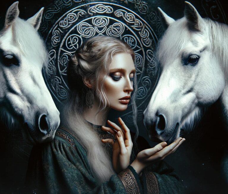 Comparatively, Epona stands in friendly conversation with Welsh RhiannonOtherworld lady of horses, sovereignty, and steadfast endurance. Rhiannon chooses her own path, rescues her reputation with grace, and returns honor to her household. more..., who carries sovereigntyThe principle of rightful authority grounded in balance and service. It ties leadership to harmony with the land and people. The concept stresses responsibility over... on a white horse, and with CernunnosHorned god of wild places, pictured seated cross-legged with stag antlers. Cernunnos governs the traffic of life between wilderness, wealth, and the underworld’s deep stores.... more..., whose wild wealth complements Epona’s domesticated abundance. None of these equivalences are simple identities, but each reveals the Celtic intuition that right relationship with animals sits at the heart of human flourishing.
