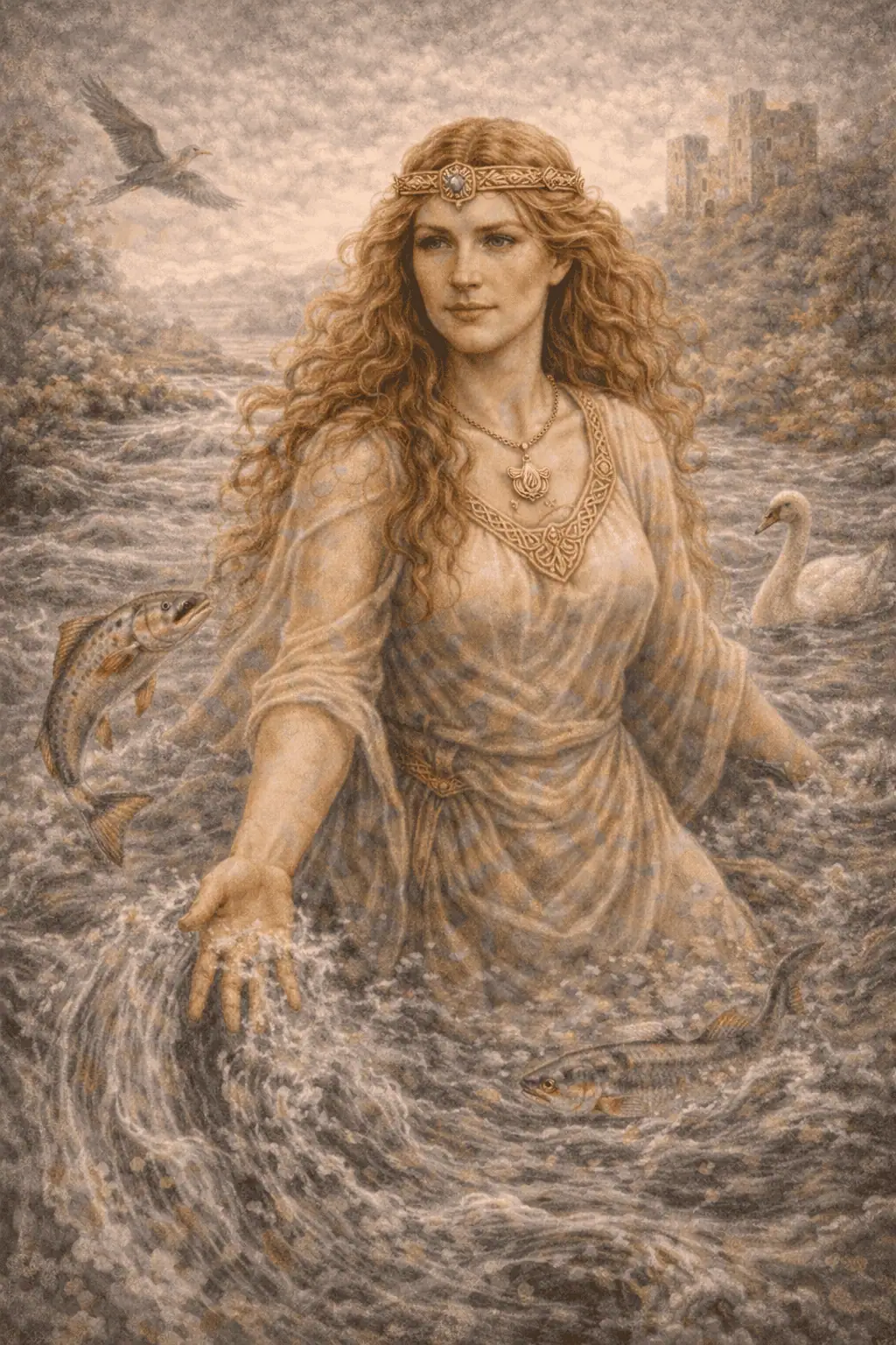 Boann’s relationships emphasize kinship and care. As mother of Aengus she stands close to the Dagda’s abundance; as a river power she resonates with Danu’s nourishing matronage. Her story also carries a caution: boundaries around holy things matter, yet the point of holiness is not hoarding. The well’s secret becomes a river precisely so life can flourish downstream. That is a sharp lesson for creators who fear sharing their work,Boann smiles and says, “Let it flow.”