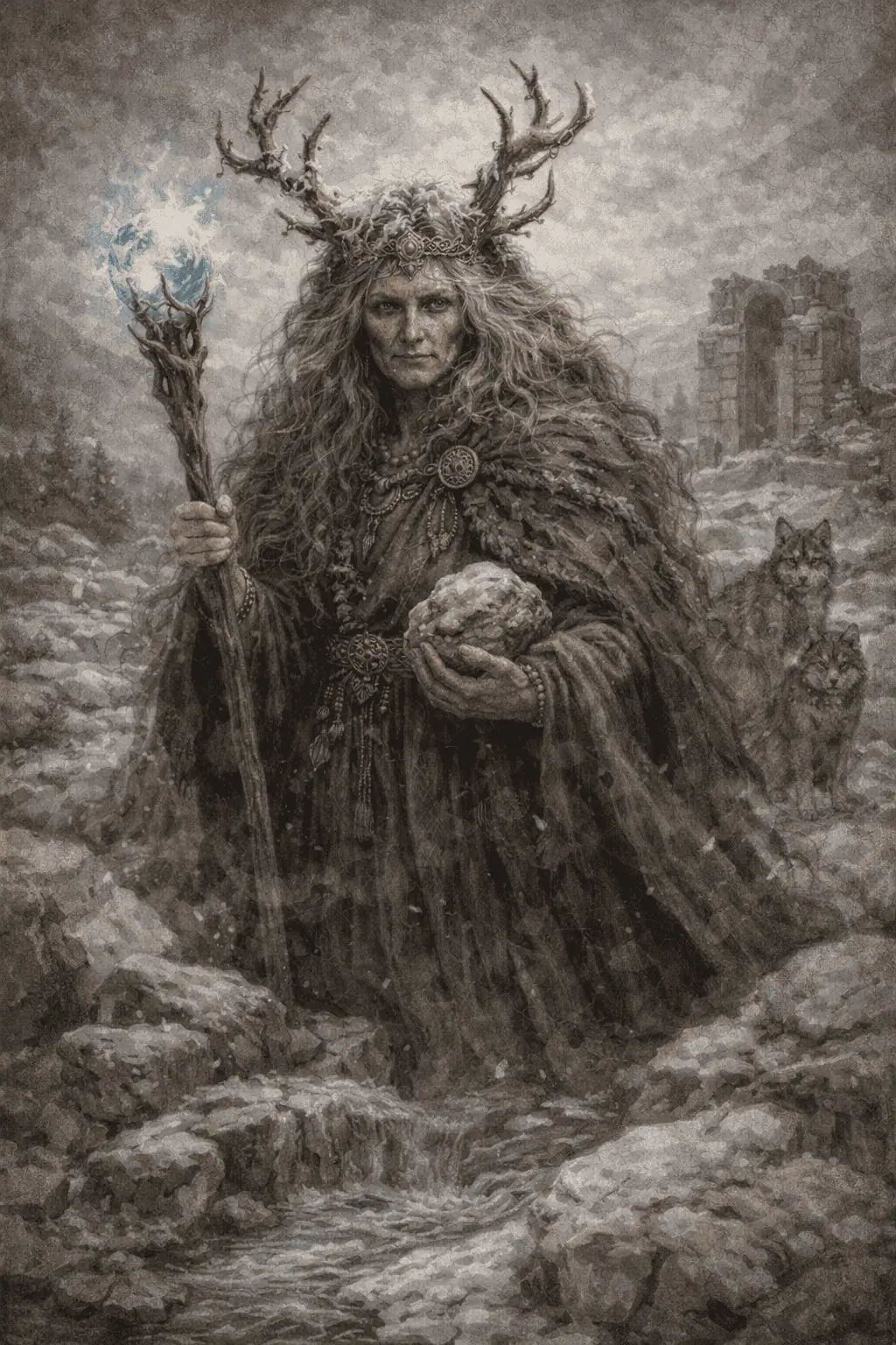 The Cailleach is winter’s person and the land’s shaper. She freezes the grass with her staff, pours stones from her apron to raise mountains, and rules the storm’s hard mercy. In Irish and Scottish lore she cycles with Brigid: one half of the year old and cold, the other young and bright. Yet the Cailleach is not cruelty; she is the discipline that makes spring meaningful. Without dormancy, no seed takes.