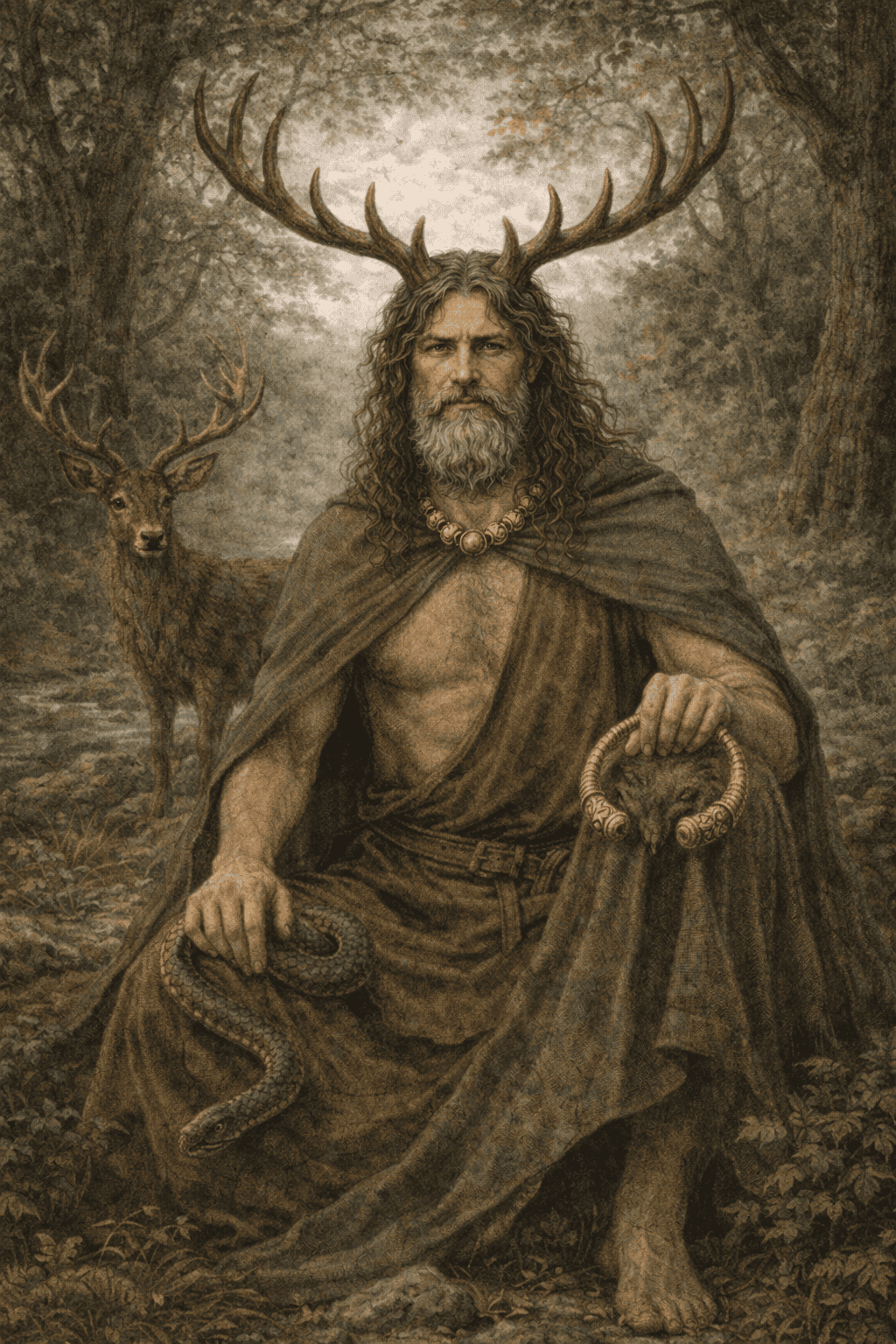 Cernunnos is the enigmatic horned god of the Celtic world, best known from reliefs and statues in Gaul and Roman Britain rather than from narrative myths. He sits cross-legged, crowned with stag antlers, often holding a torc and a ram-horned serpent, with animals gathered near. Coins spill from a bag, hinting that wealth and wildness are not enemies but parts of one living economy.