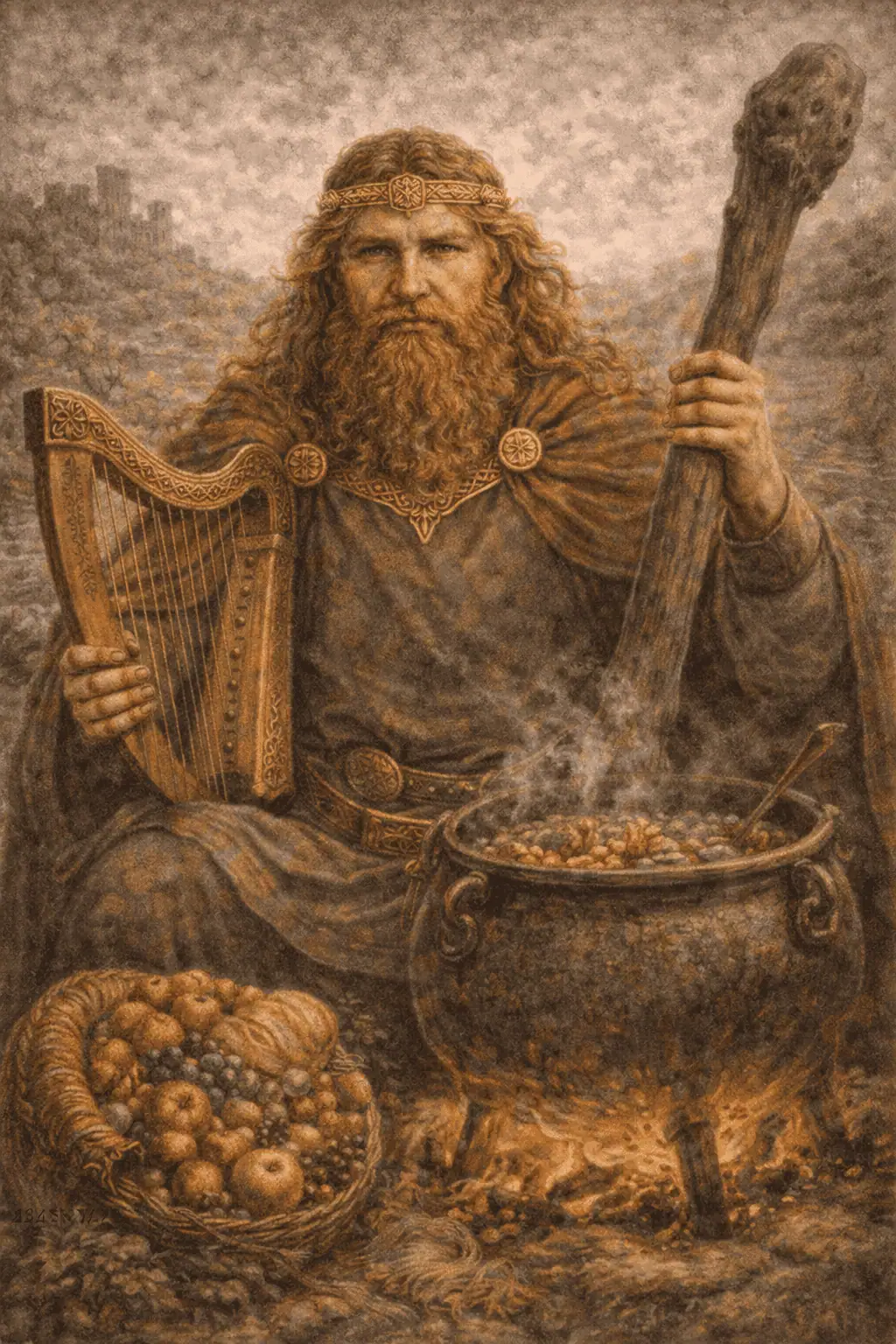 The Dagda is the jovial powerhouse of the Tuatha Dé Danann: a kingly figure whose gifts are abundant and whose appetite is legendary. His name is commonly explained as “good god,” meaning not morally perfect but supremely capable. He feeds the people from a cauldron that never empties, wields a club that can kill with one end and restore life with the other, and plays a harp that commands the seasons to move in their proper order.