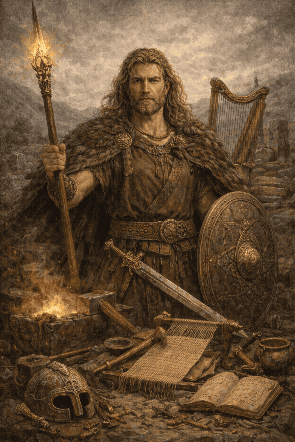 Lugh is one of the most radiant and compelling figures in the Irish mythological tradition: a master of many arts whose brilliance touches craft, strategy, sovereignty, and creative skill. He is remembered as the young champion who arrives at exactly the right moment, the one who knows how to do what must be done. Beginners can think of him as the embodiment of skill brought to purpose, the spark of inspiration that becomes real through mastery.