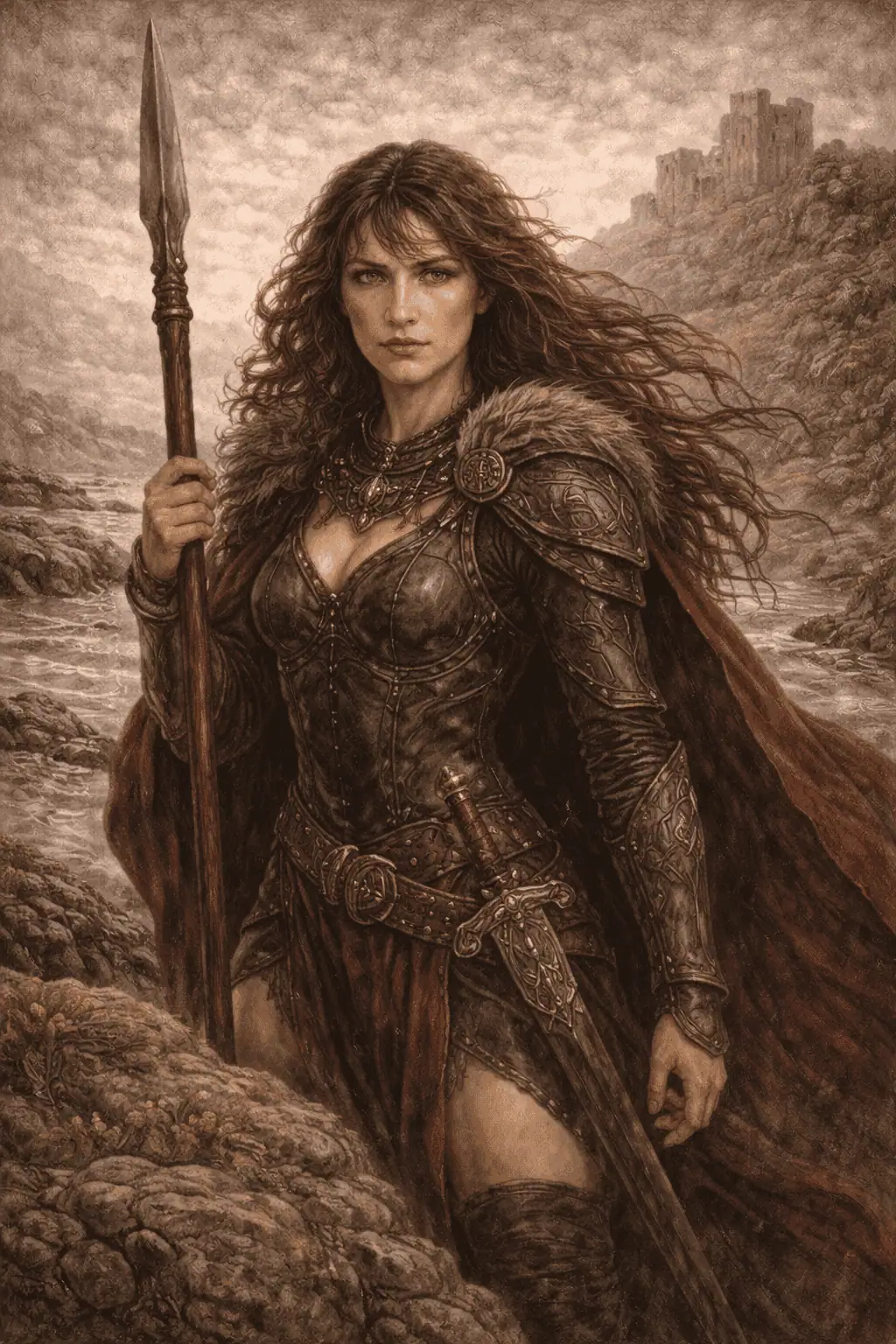 Scáthach is typically depicted as a formidable woman warrior, often armored, carrying a spear or sword, and associated with a fortress or training ground. Later visual traditions place her in rugged, liminal landscapes such as cliffs, sea-crossings, or remote strongholds. She is not portrayed as youthful or decorative; depictions emphasize authority, experience, and physical capability.